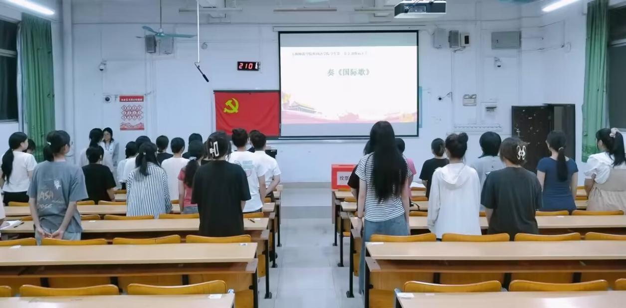 陈毅宣读关于党支部委员会换届选举办法,并对选举流程做了说明。参会学生党员以举手表决方式,一致同意马晓旭、韦瑛健担任监票人,张彩珍、黄秋婷担任计票人。陈毅对田华丽、杨梦思等7名候选人的基本情况进行介绍。大会采取差额选举、不记名投票的方式进行投票选举,顺利产生新一届支委会委员:田华丽、杨梦思、李泓莹、陈毅、周泳(按照姓氏笔画排序)五名同志。最后,党员大会在全体党员奏唱《国际歌》中圆满结束。