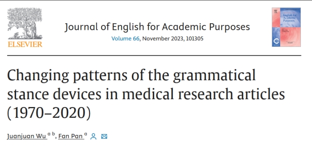近日,我校167net必赢入口教师吴娟娟与华中科技大学潘璠教授共同合作,在国际期刊《学术英语杂志》(Journal of English for Academic Purposes)发表了题为Changing patterns of the grammatical stance devices in medical research articles (1970–2020)”的研究论文(Doi: 10.1016/j.jeap.2023.101305)。