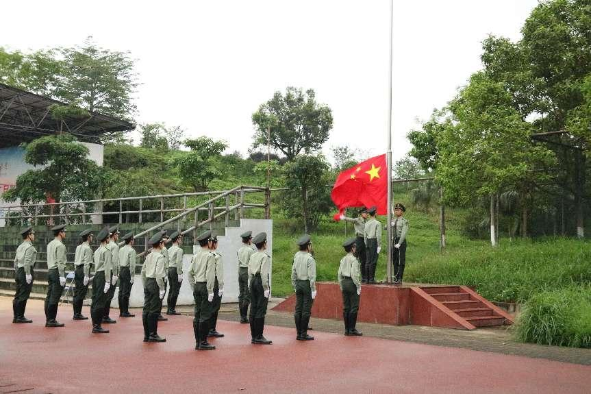 上午7点,伴随着激昂的《义勇军进行曲》响起,国旗班高举国旗,踏着整齐有力的步伐走向升旗台。全体生肃然起敬,齐声高唱国歌,并对国旗行注目礼,鲜艳的五星红旗随即冉冉升起。