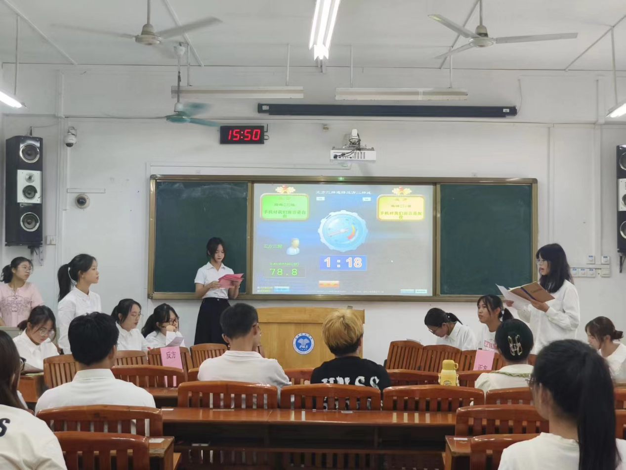 第一场比赛中,正方商务英语232班与反方英语231班就辩题“手机对我们而言是自由的”与“手机对于我们而言是奴隶的”展开激烈的辩证论析。双方辩手反应灵敏,据理力争,根据对方的发言寻找疏漏,为自己的辩论寻找有力的支撑点。
