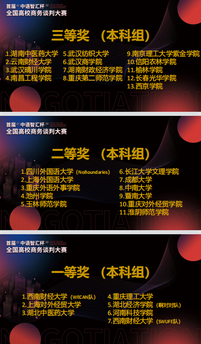 “中语智汇杯”全国高校商务谈判大赛是由国家一级学会中外语言文化比较学会联合四川外国语大学主办,中语智汇科技(厦门)有限公司承办的商务英语专业比赛,参赛队伍来自上海外国语大学、暨南大学、上海对外经贸大学、四川外国语大学等全国各地共150余所高等院校。比赛分为初赛、复赛和全国总决赛三个阶段。初赛为校内选拔赛,采用线上比赛形式;复赛和全国总决赛为团体赛,采用线上评审形式,比赛内容为商务谈判策划案撰写;全国总决赛采用现场面对面商务谈判形式。此次比赛让学生对国际商务谈判有了更直观、真实、生动的体验,同时为学生提供实践和锻炼的机会,锻炼商务谈判能力,拓展商务视野,增强团队协作共赢的能力。