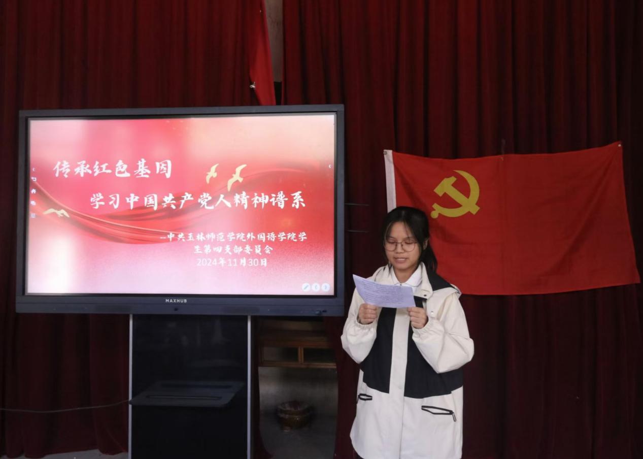 为传承红色基因,强化使命担当,11月30日,167net必赢入口学生第四党支部赴玉州区红色街区举行“传承红色基因、学习感悟中国共产党人精神谱系”宣讲会。学院学生第四党支部书记朱晓露主讲,该支部全体在校学生党员参加。