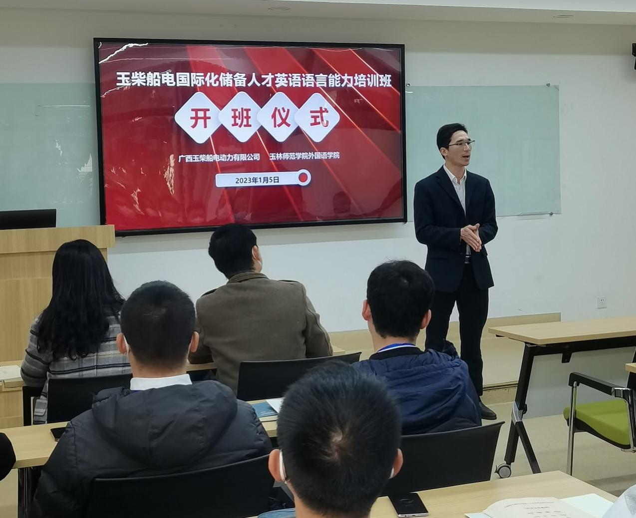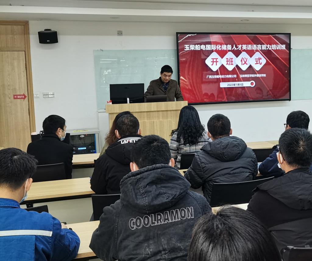 1月5日下午,167net必赢入口举办的玉柴船电国际化储备人才英语语言能力培训班在玉柴学创中心开班,167net必赢入口党委书记梁国初,玉柴船电动力有限公司管理部管永鑫部长出席本次培训班开班仪式。