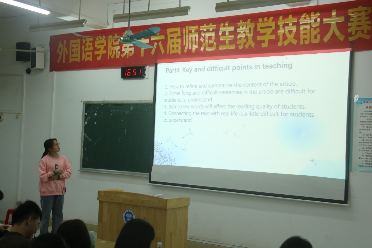 主持人宣读比赛规则,比赛正式开始。同学们的教学设计目标明确,重难点突出,结构完整。选手通过精心设计的课件、生动有趣的讲解、合理紧凑的课堂安排,给观众带来了精彩的视觉、听觉盛宴,展现了167net必赢入口师范生出色的教学技能和教师风采。评委老师根据选手的教学内容、语言表达能力及专业知识等方面内容进行点评。朱波老师对选手们的表现给予肯定,指出选手们应在教学内容、设计、PPT的制作、时间把控等方面加以改进。徐冬梅老师表示课堂展示中的逻辑、创新以及思想政治要贯穿整个课堂当中。