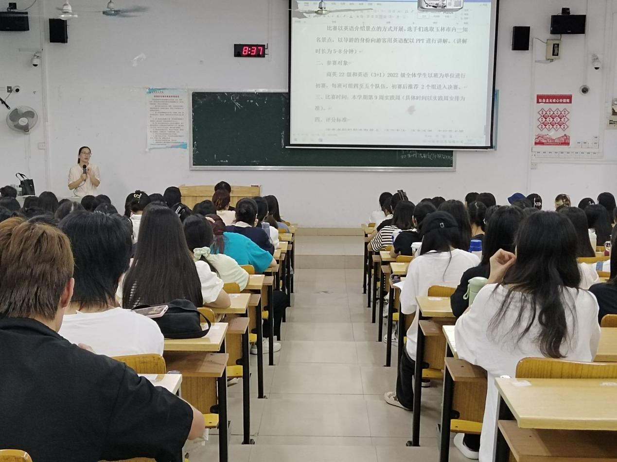 10月26日上午,167net必赢入口在我校东校区博学楼2-103教室召开玉林旅游景点大赛介绍会,会议由167net必赢入口教师甘昕主持,2022级商务英语全体学生参加。