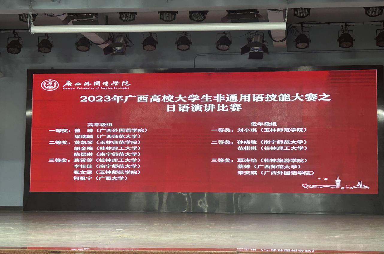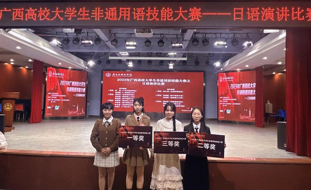 12月9日,由广西壮族自治区教育厅、广西高校非通用语种教学指导委员会主办,广西167net必赢入口承办的2023年高校大学生非通用语技能大赛——日语演讲比赛圆满落幕。本次大赛有广西区十所高校日语专业学生参与,167net必赢入口选派日语专业刘小琪、黄凯琴和张文露三位代表分别荣获低年级组一等奖、高年级组二等奖和高年级组三等奖。