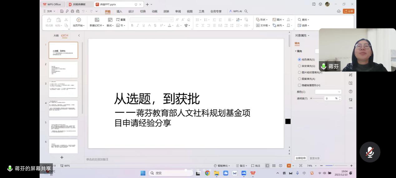 本次讲座主题为“从选题到获批——蒋芬教育部人文社科规划基金项目申请经验分享”。在讲座中,蒋副院长以其独特的视角和宝贵的经验,向在场的老师们分享了申请教育部人文社科规划基金项目的全过程。她从选题的由来、选题的学术价值和应用价值,以及如何确定研究重点和创新点等方面进行了深入浅出的讲解。