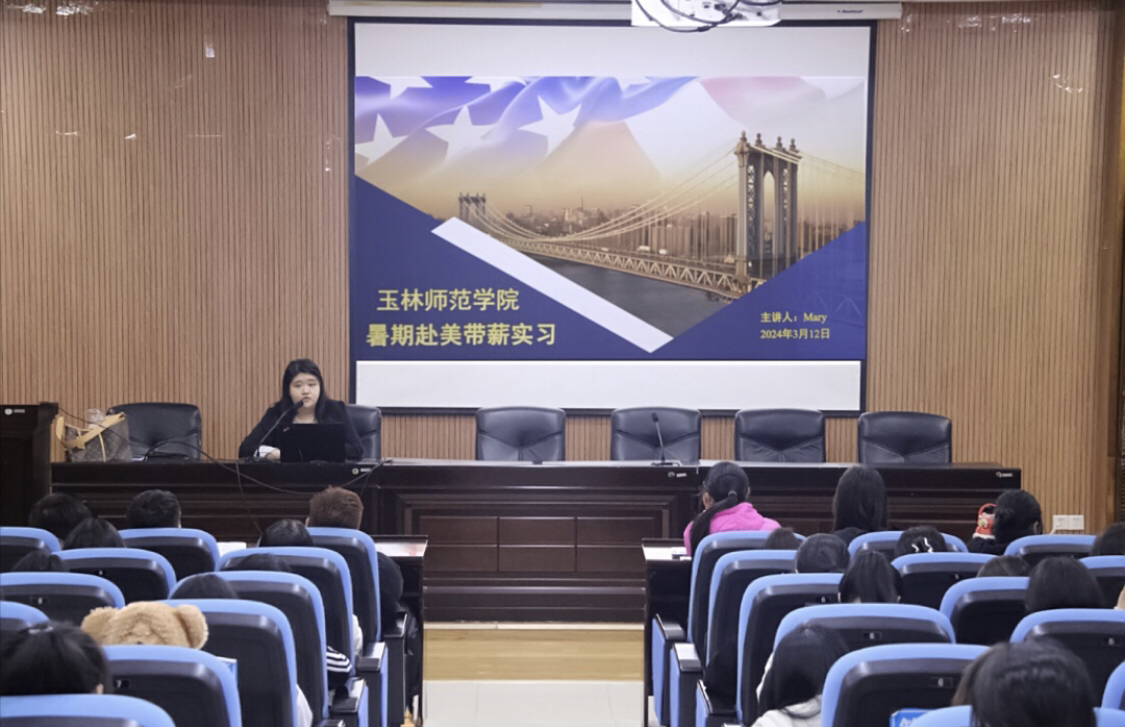 为使167net必赢入口更清晰地了解暑期赴美带薪实习活动,从而对未来学习生活做出规划,3月13日,167net必赢入口在我校东校区知行楼博士论坛召开暑期赴美带薪实习宣讲会,本次宣讲会由赴美带薪实习活动项目负责人胡晓雯主讲,167net必赢入口辅导员孙剑及英语专业全体大三学生参加。